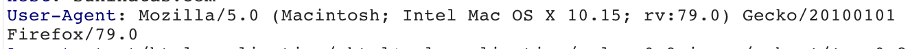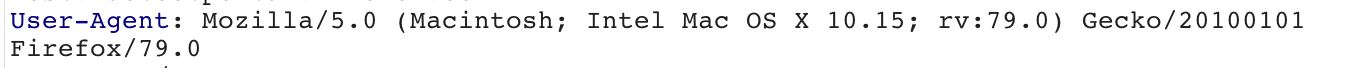 User-Agent란 뭐,,, 구글링으로 공부한 바로는 서버에 사용자의 정보? 사용자의 운영체제, 웹 브라우저의 버전 등의 정보를 넘길 때 사용하는 것이다! 위 캡처를 보면, 나는 매킨토시 환경에, Mac OS X 10.15 버전의 운영체제를 사용하고 있고, Firefox 79.0 버전의 웹 브라우저를 사용하고 있다.