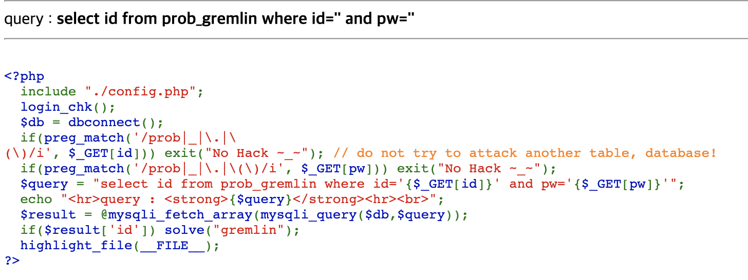 gremlin 문제의 php 코드다. php 코드에서는 우리가 GET 방식으로 전달한 id값과 pw값이 어떻게 처리되는지 보여준다. 대충 한 번 훑어보면 $_GET['id']와 $_GET['pw']에서 특정 문자의 필터링을 거쳐서 만약 있다면! exit하게 한다.